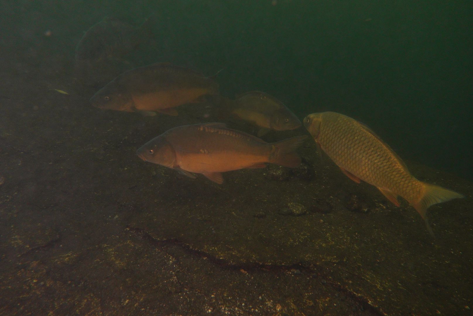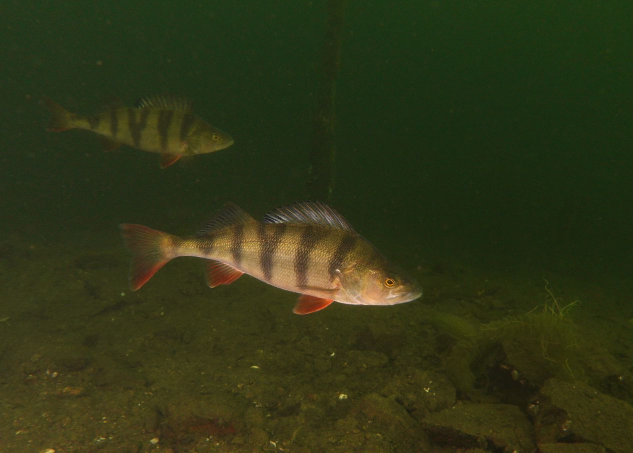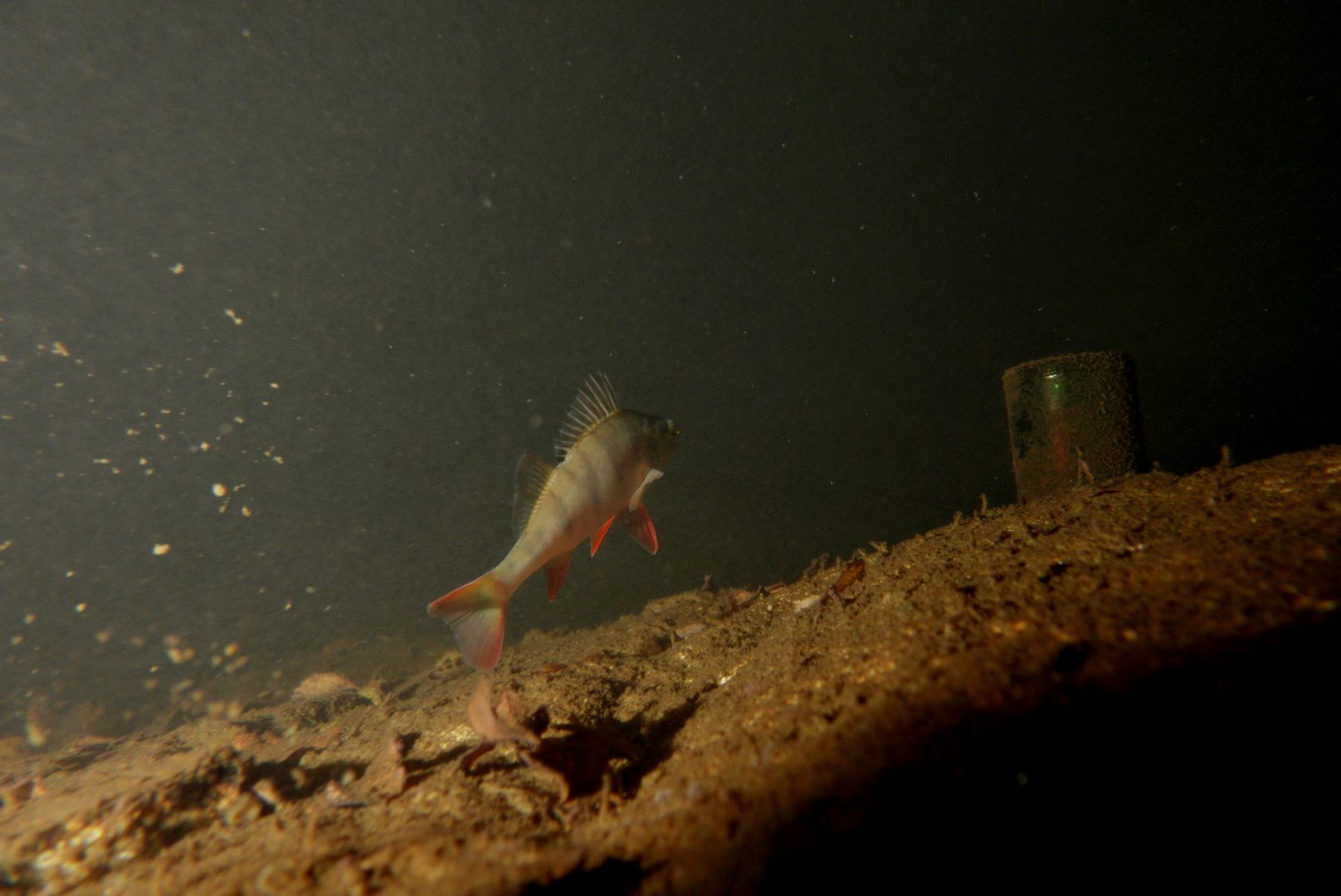 Überrascht war ich, dass die Barsche durchaus noch aktiv waren. Ich hatte zuerst die Videoleuchte auf 30%. Ab 50 cm hat dies die armen Barsche zur Vollbeschleunigung gebracht. Ist mir bei wärmerem Wetter nie aufgefallen. Ich hoffe, sie haben jetzt kein Energiedefizit – die Leuchte habe ich sofort auf 3% gedimmt. Der Spot der Tauchlampe sorgt eh für besseren Durchblick.