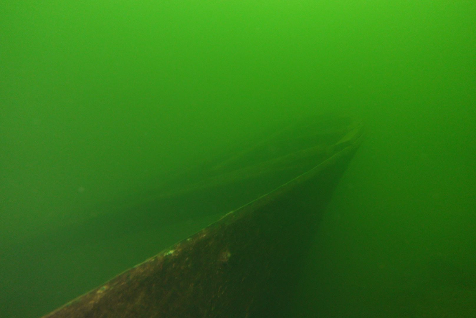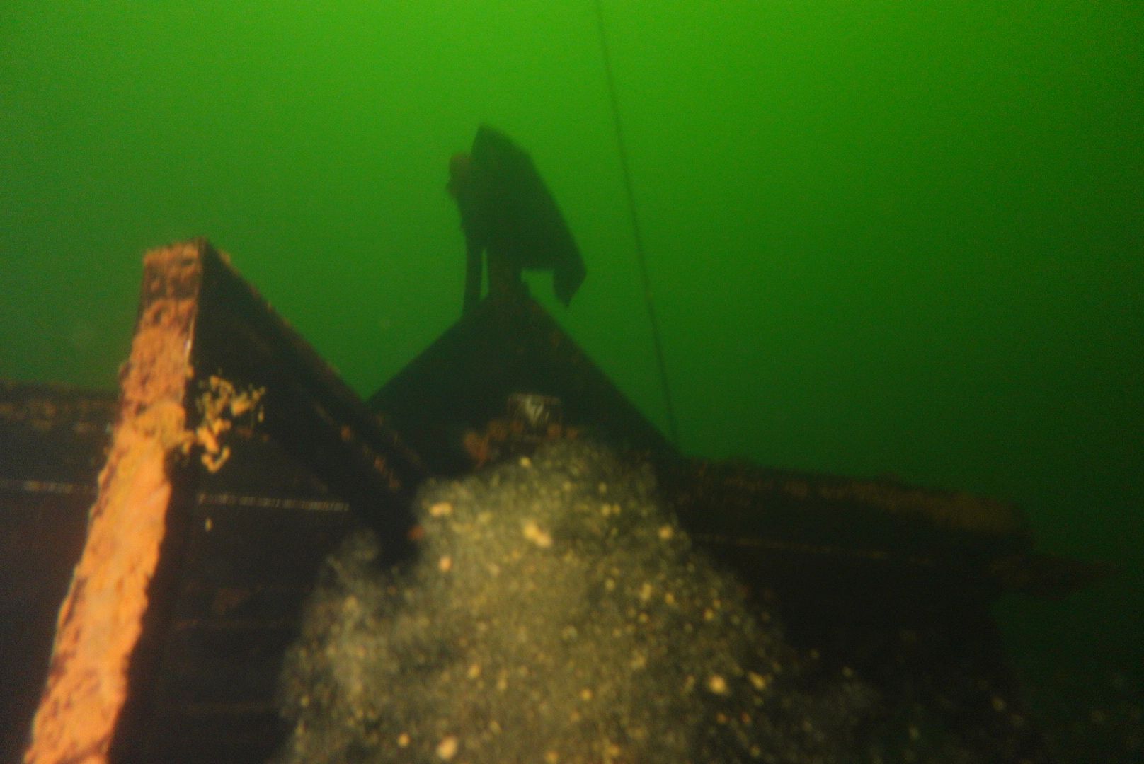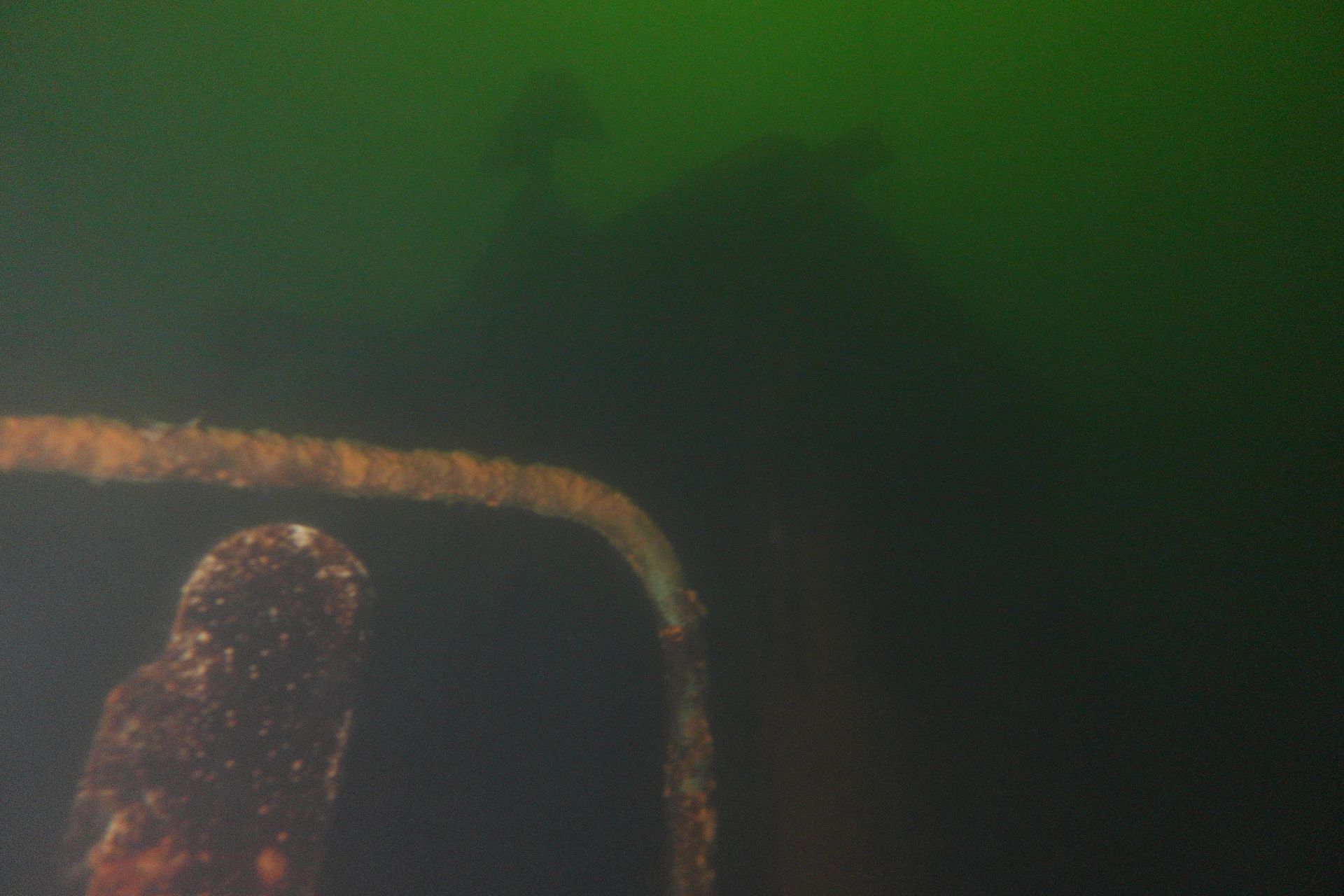 Die oberen 10 m waren extrem trübe bei 1 m Sicht. Ab 10 m wurde es besser, aber auch deutlich kälter. Aber zur Winterszeit mach ich eh meine Tieftauchgänge und kam so auch mal wieder bei der „Mühlberg“ vorbei. Auf 20 m war es stockduster. Die Silhouette der alten Elbfähre ist dann immer wieder ein „gruseliger“ Anblick. Wenn sie im Licht der Lampe aus dem Dunkelgrün auftaucht, schlägt mein Herz auch nach mehr als 30 Besuchen noch höher. Sie ist schon das schönste Binnenseewrack, das ich kenne.