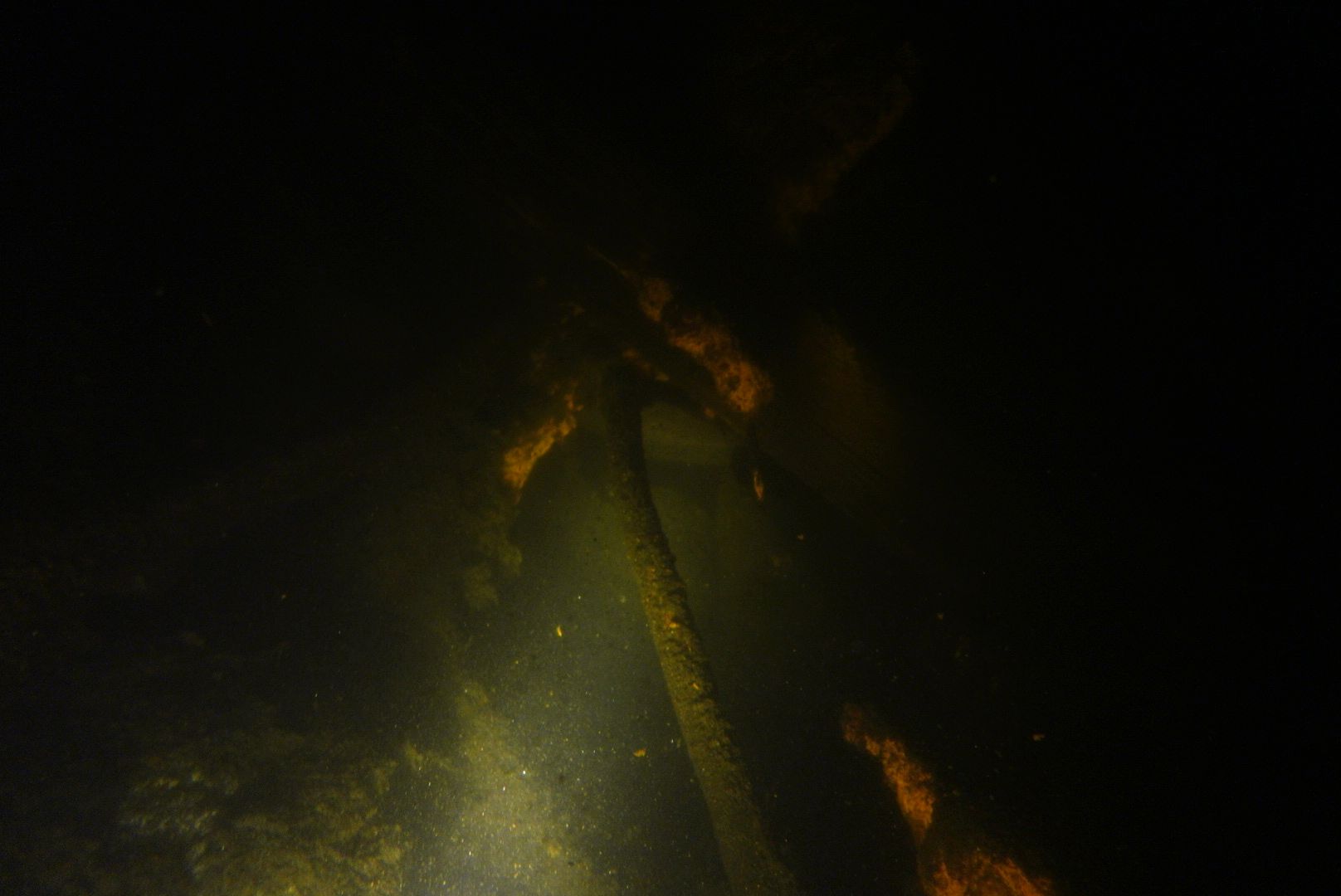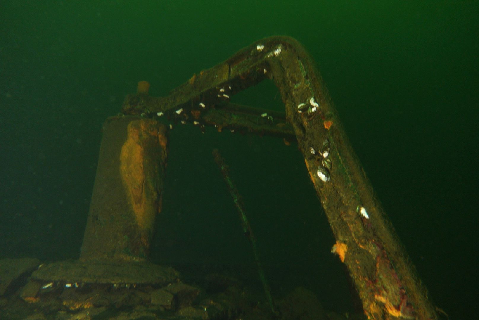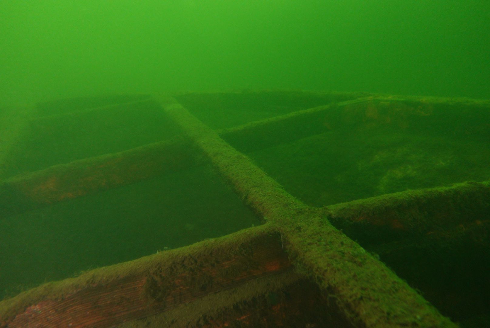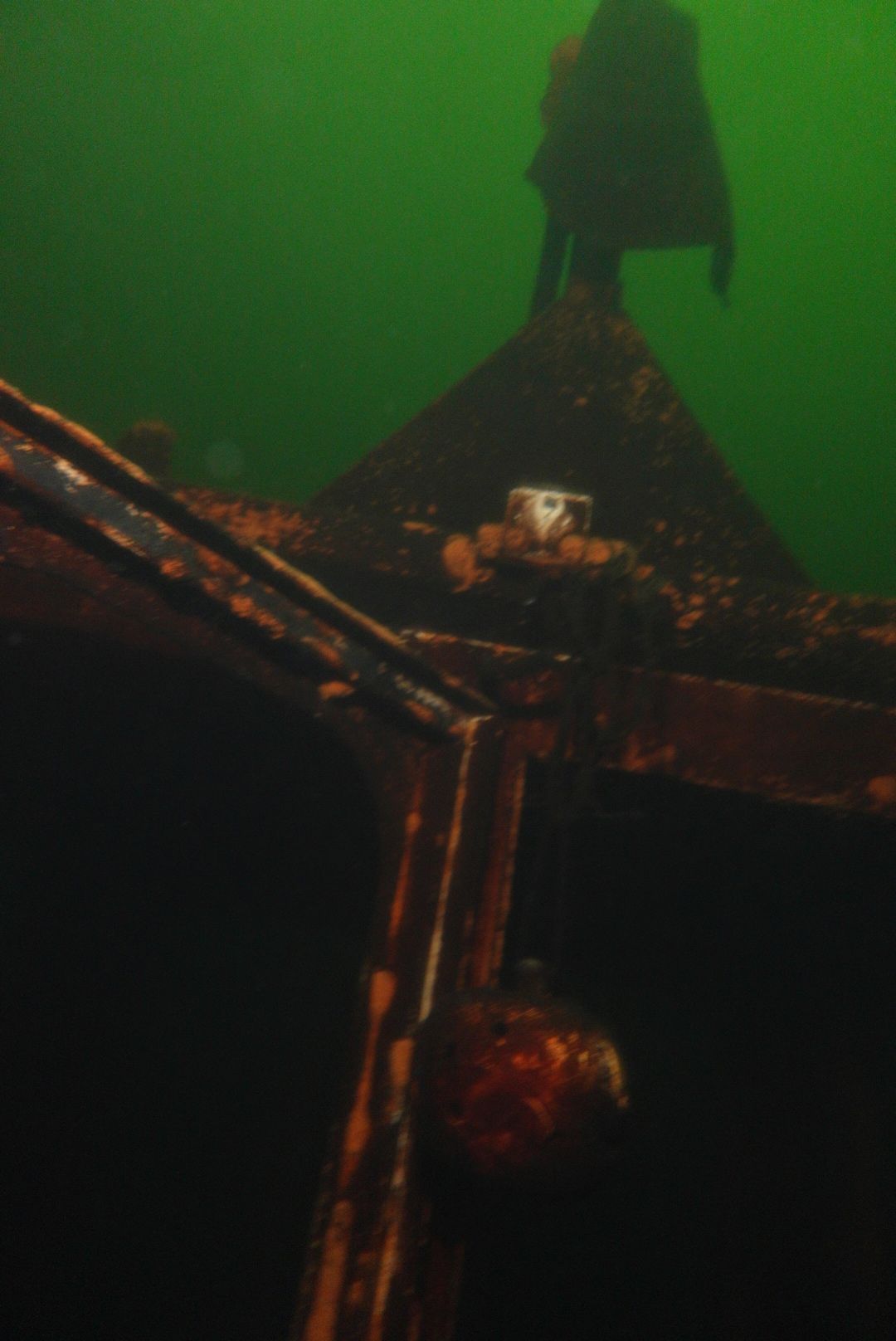 Die oberen 10 m waren extrem trübe bei 1 m Sicht. Ab 10 m wurde es besser, aber auch deutlich kälter. Aber zur Winterszeit mach ich eh meine Tieftauchgänge und kam so auch mal wieder bei der „Mühlberg“ vorbei. Auf 20 m war es stockduster. Die Silhouette der alten Elbfähre ist dann immer wieder ein „gruseliger“ Anblick. Wenn sie im Licht der Lampe aus dem Dunkelgrün auftaucht, schlägt mein Herz auch nach mehr als 30 Besuchen noch höher. Sie ist schon das schönste Binnenseewrack, das ich kenne.