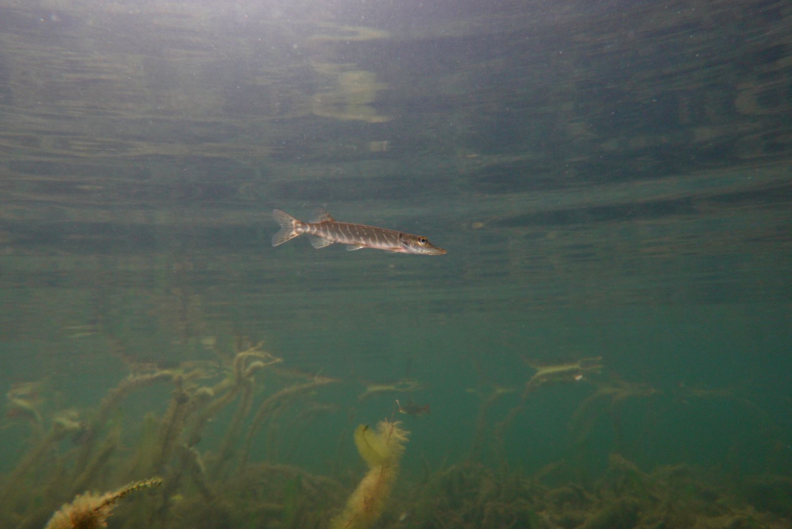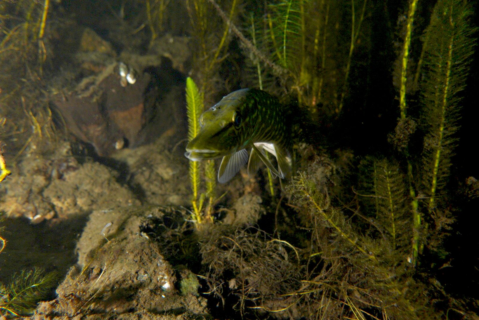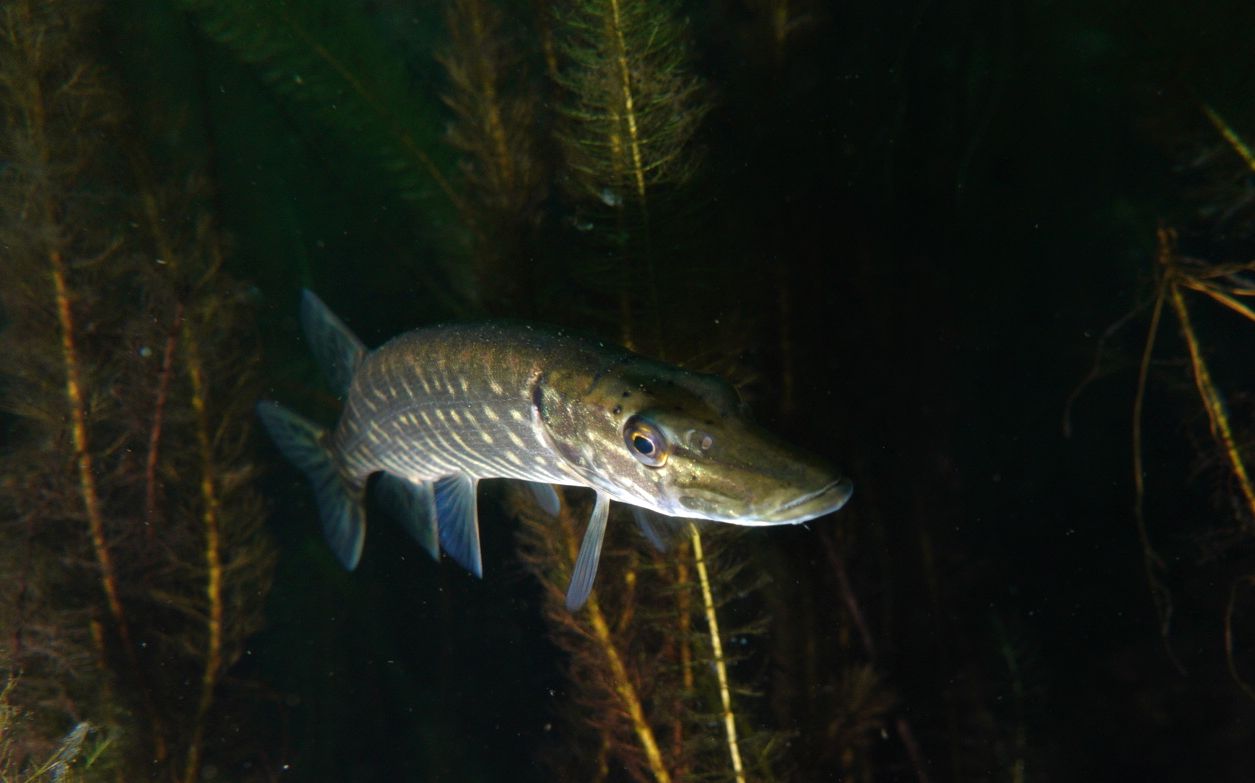 Die Schleie habe ich nun schon seit Anfang Oktober nicht gesehen. Jetzt werden die sonst so hektischen Rotfedern und Plötzen träger. Man kann also auch mal eine brauchbare Aufnahme von ihnen machen. Insgesamt wirkte der Fischbesatz schon leicht ausgedünnt. Doch alle Hechte sind noch am Anlegen von Winterreserven. In der Wahl der Jagdtaktik gibt es erhebliche Unterschiede. In Lauerstellung direkt unterhalb der Wasseroberfläche, senkrecht im Schilf stehend, verdeckt im dichten Bewuchs oder unter Baumstümpfen.
