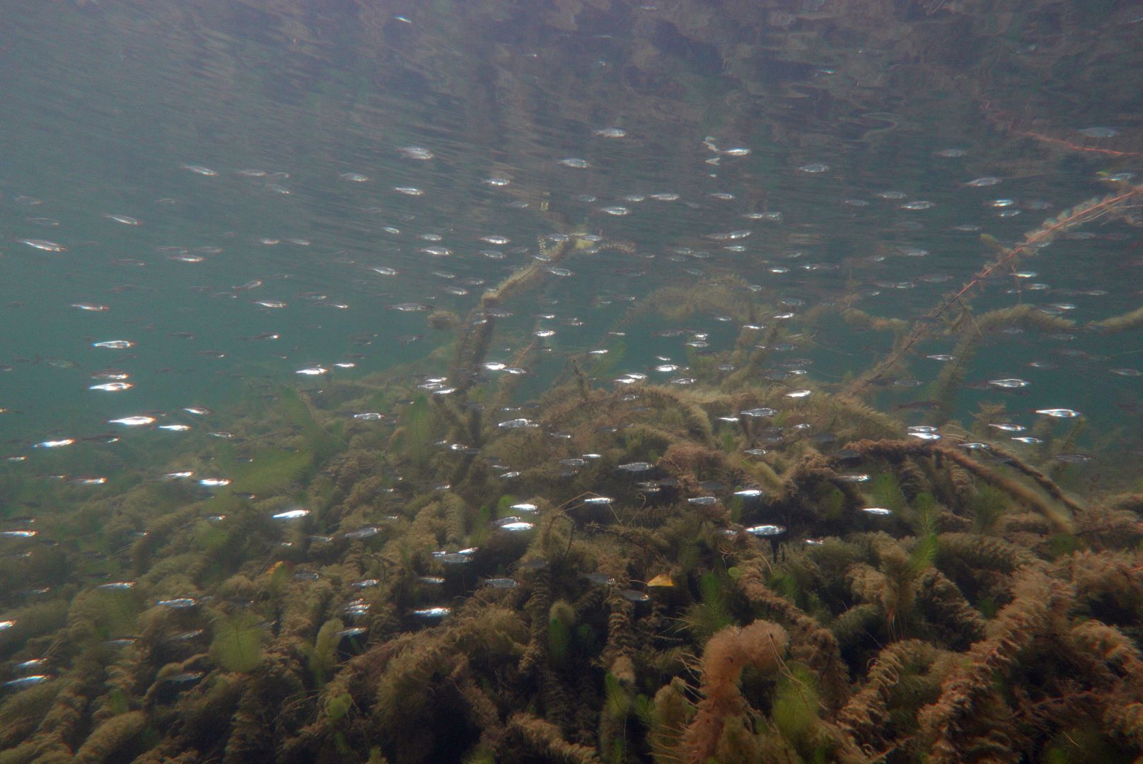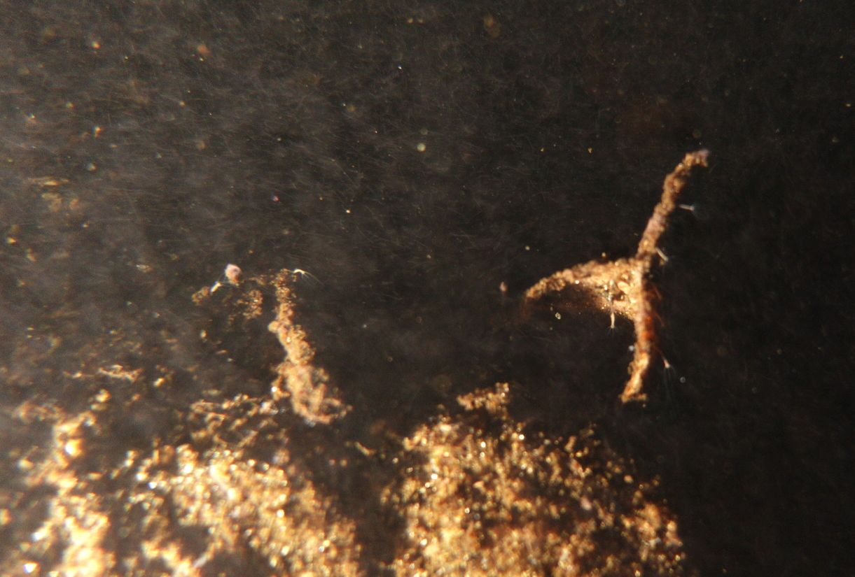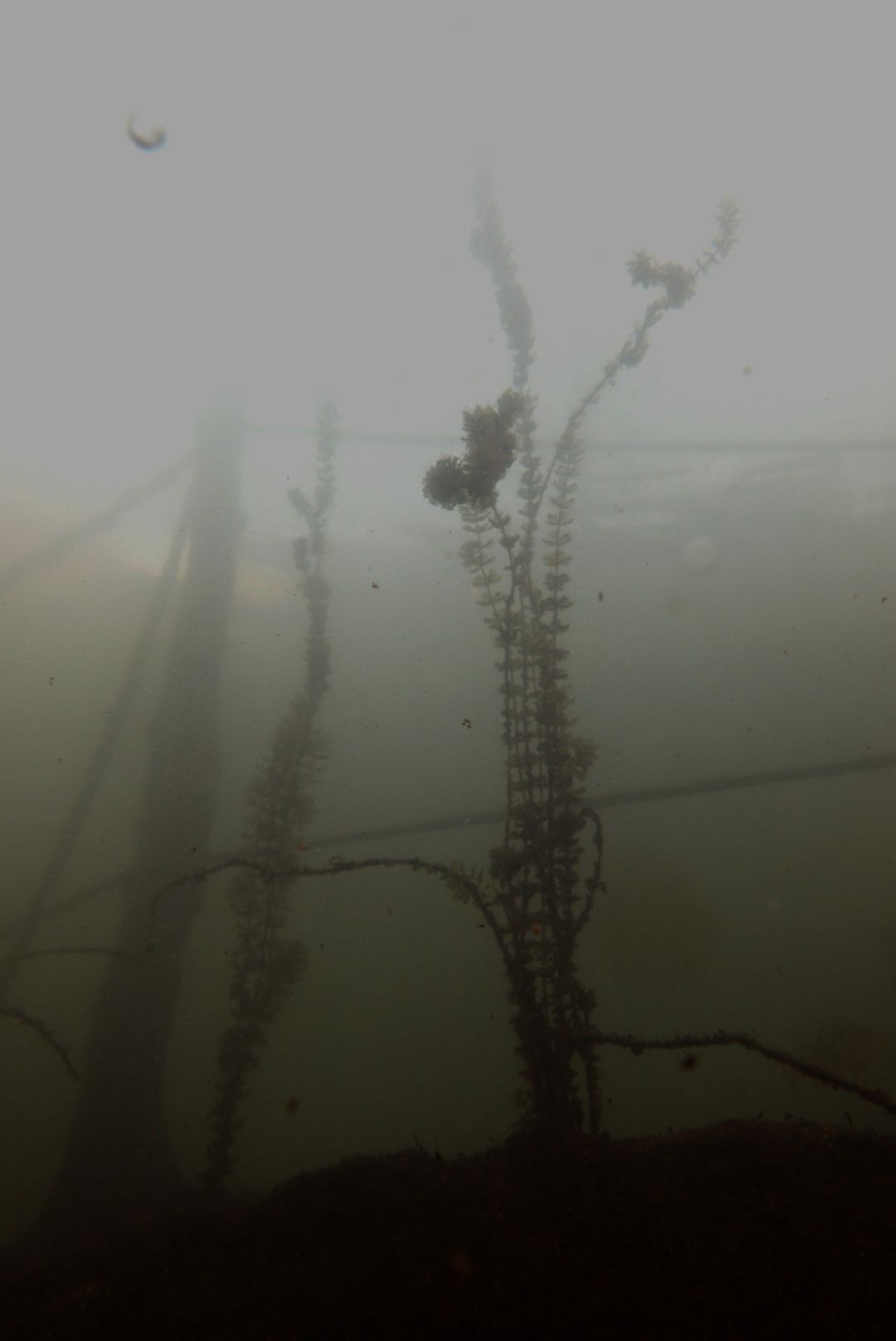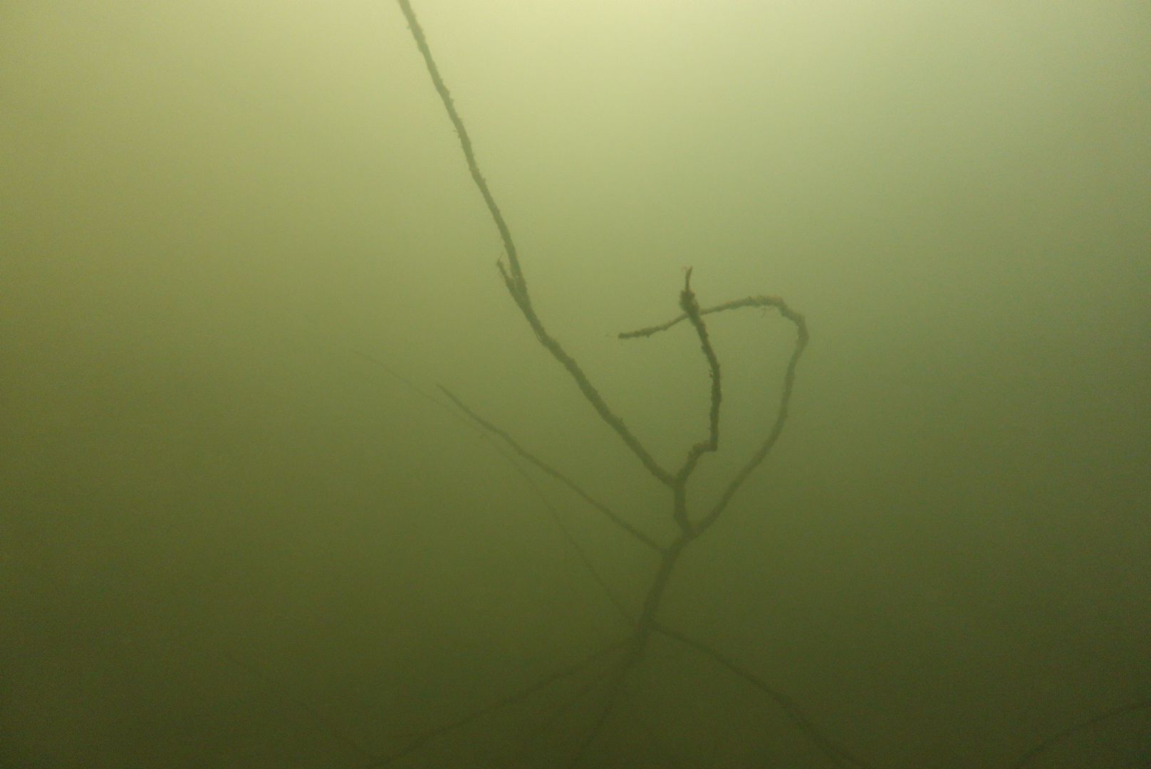 Erst auf den Bildern war für mich eine der Ursachen der krass schlechten Sicht zu erkennen. In den oberen 5m gab es trotz der niedrigen Temperaturen eine massives Auftreten von Fadenalgen (?). Die paar Wasserpolypen kommen mit filtern nicht hinterher ..