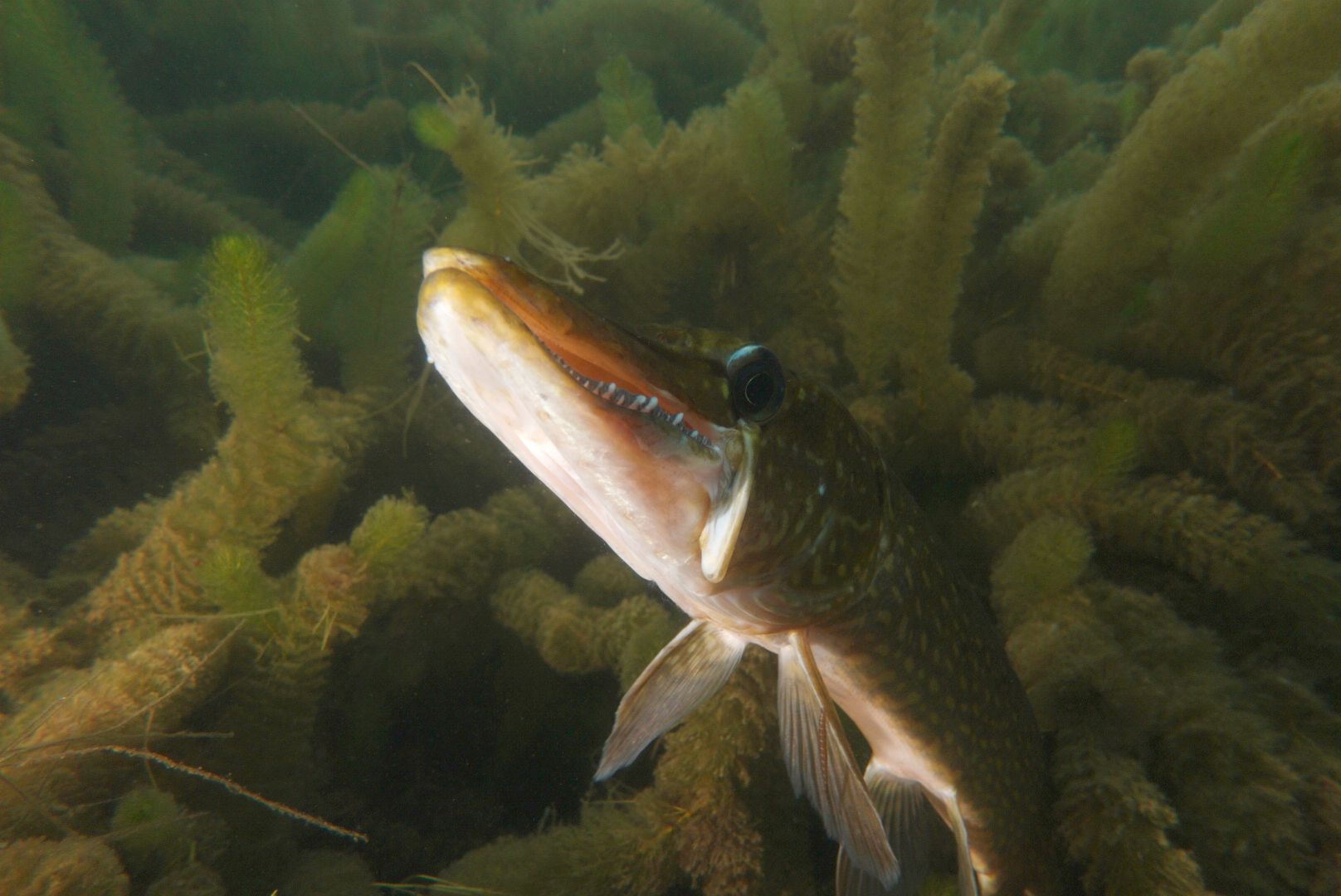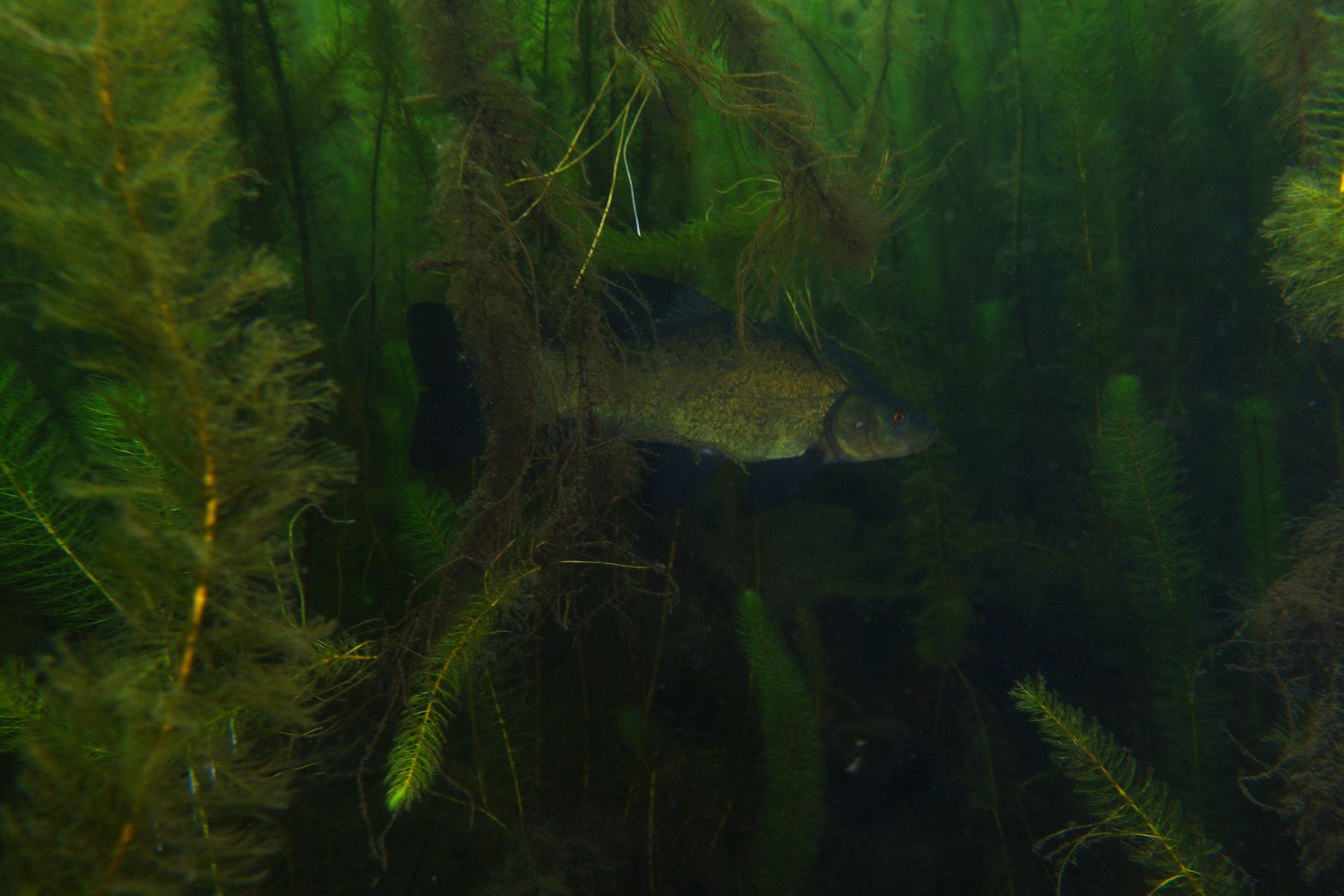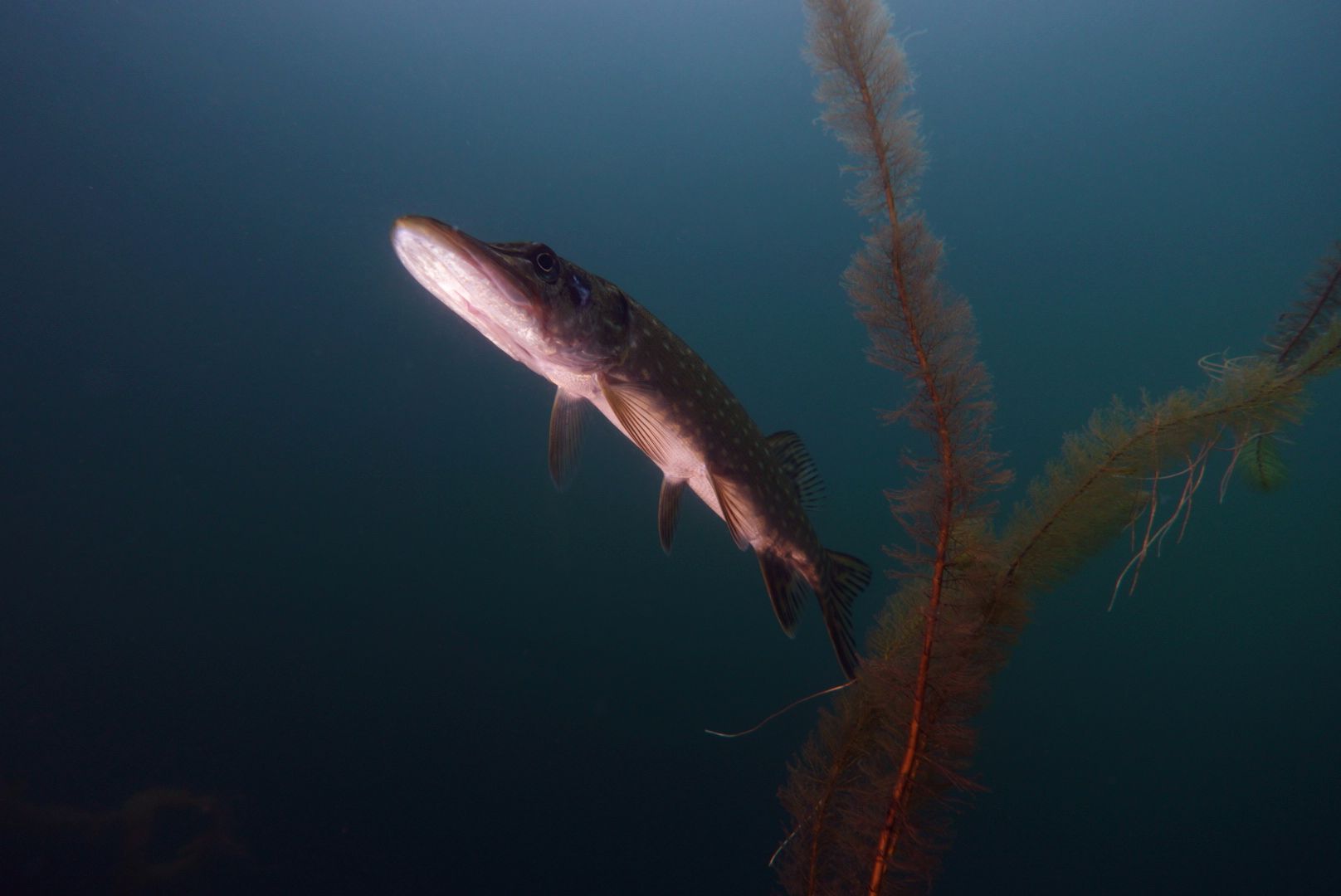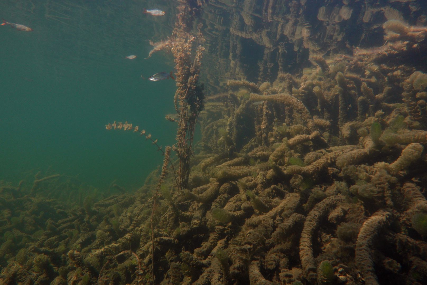 Alle 5m ein Hecht, zwei Karpfen pflügen den Boden, Weißfisch wohin man sieht und zwei Begegnungen mit Schleien. Leider hatten diese schmucken Fische eine recht hohe Fluchtdistanz von 2m beim Ausatmen.