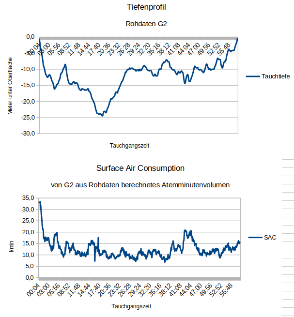 Subsurface berechnet zwar die SAC, zeigt aber als Graph nur den aktuellen Flaschendruck an. Die Exportfunktionen sind aber sehr vielfältig, so dass man nicht erst aus den Rohdaten des Sensors für Flaschendruck und und Umgebungsdruck (inklusive Rauschem und Übertragungsfehlern) mittels Glättung, … die SAC selber berechnen muss, sondern diese als csv aus dem Programm auslesen und selber darstellen kann.