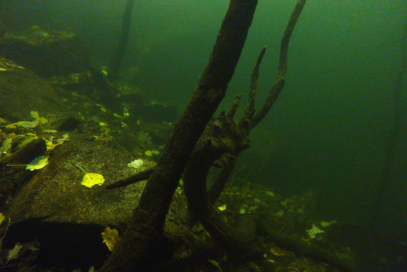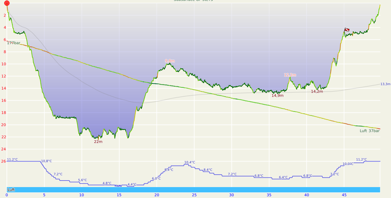 Vielleicht lohnt sich ja doch auch ein Tauchgang im Winter – dann halt den Grund des Steinbruchs absuchen. Aber wann ist dafür die beste Sicht? Für dieses Jahr habe ich eigentlich mit Ammelshain abgeschlossen, obwohl die Sicht sich langsam klärt. Trotz Polizeiübung am Vortag war die Sicht am 6.11. besser, als fünf Tage davor. Im Bereich bis 12m ist die Temperatur mittlerweile bei einheitlichen 10 °C.