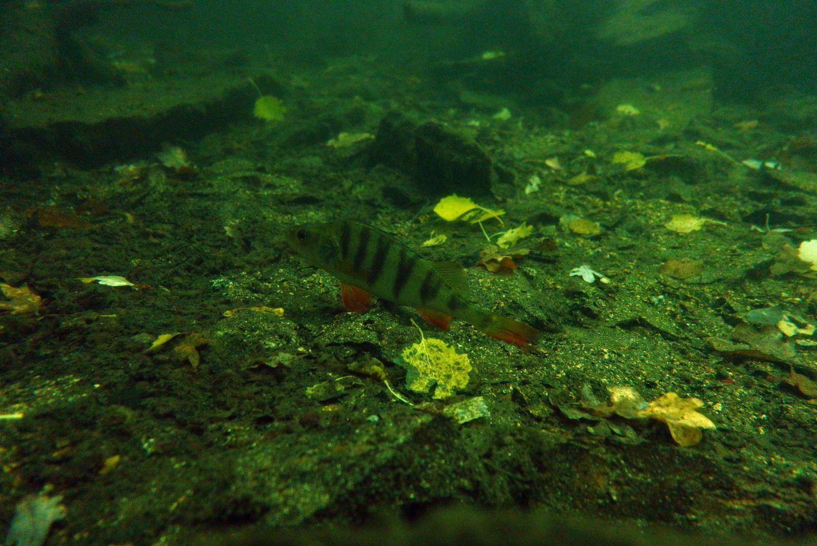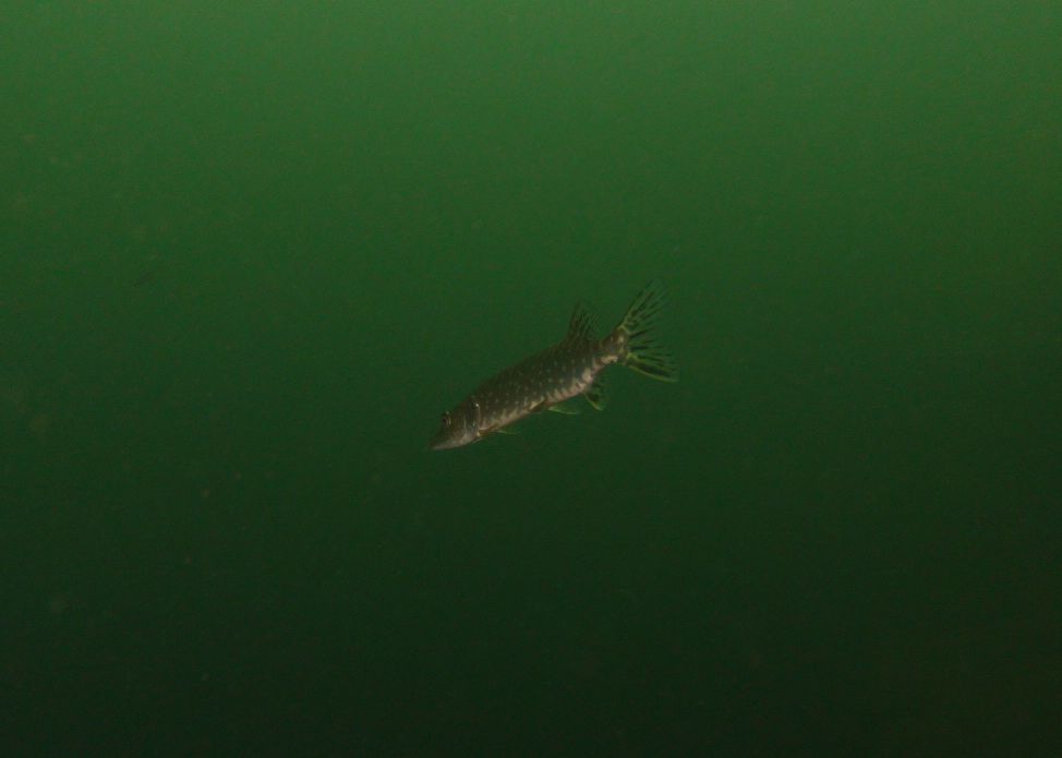 Überrascht war ich, dass die Barsche durchaus noch aktiv waren. Ich hatte zuerst die Videoleuchte auf 30%. Ab 50 cm hat dies die armen Barsche zur Vollbeschleunigung gebracht. Ist mir bei wärmerem Wetter nie aufgefallen. Ich hoffe, sie haben jetzt kein Energiedefizit – die Leuchte habe ich sofort auf 3% gedimmt. Der Spot der Tauchlampe sorgt eh für besseren Durchblick.