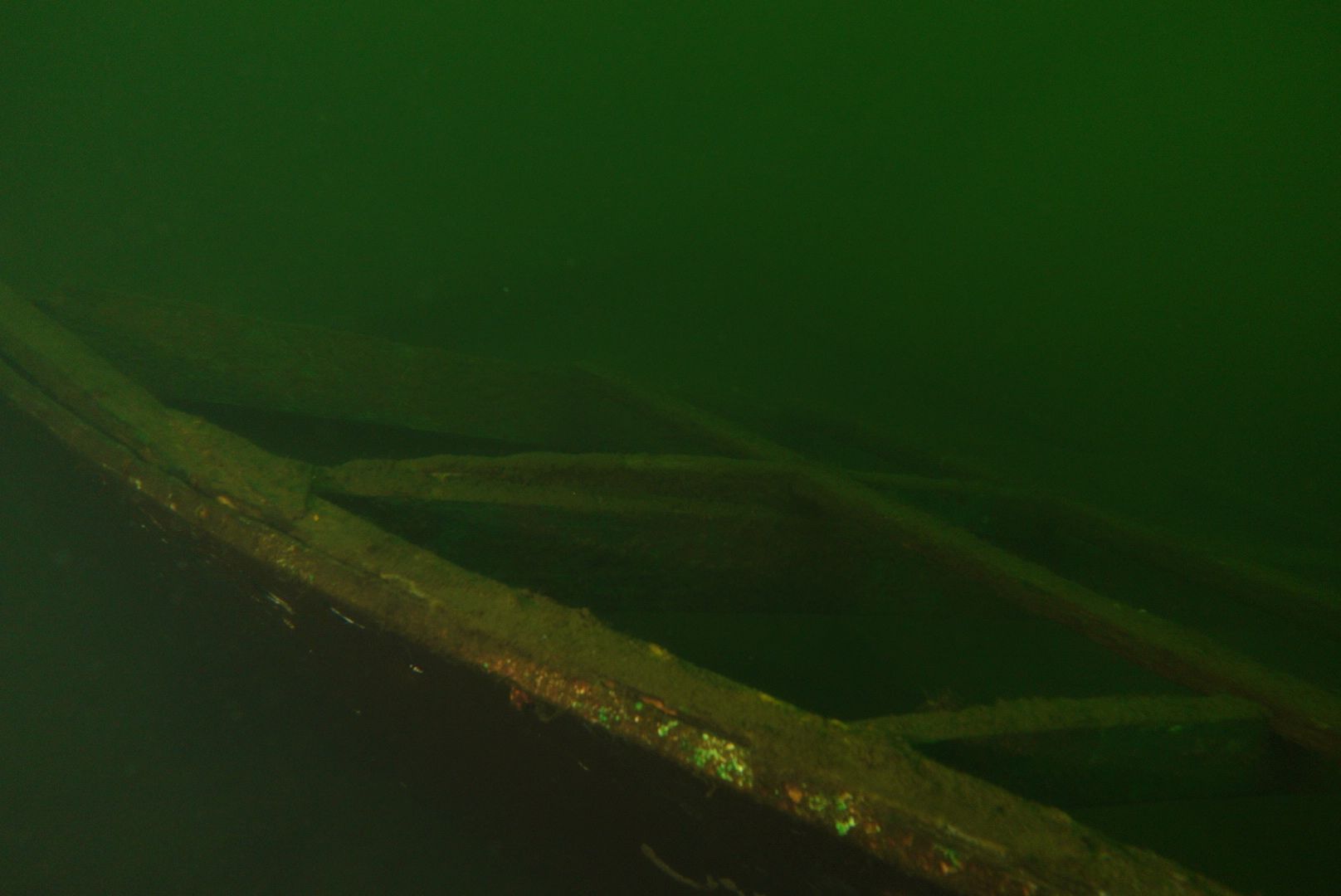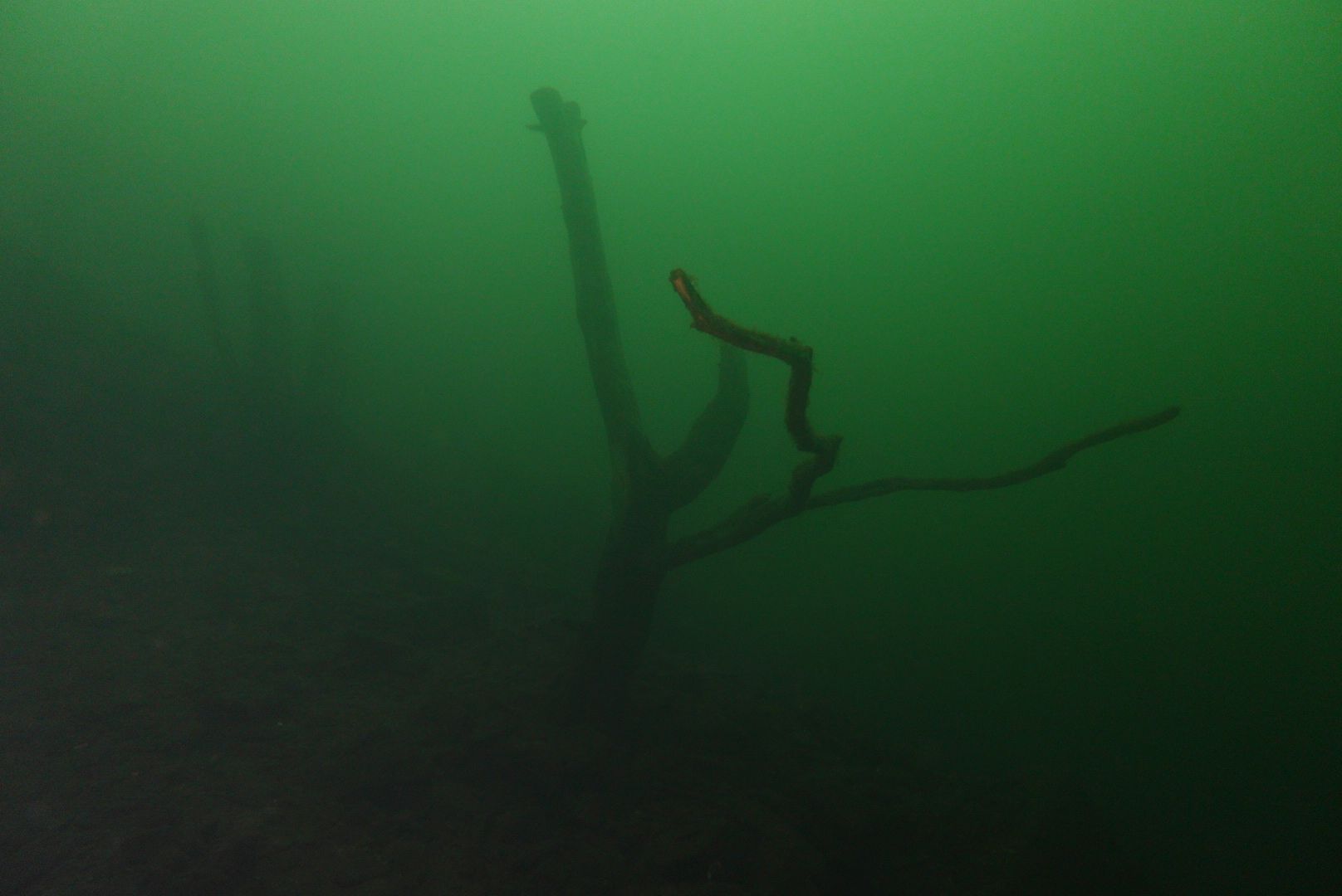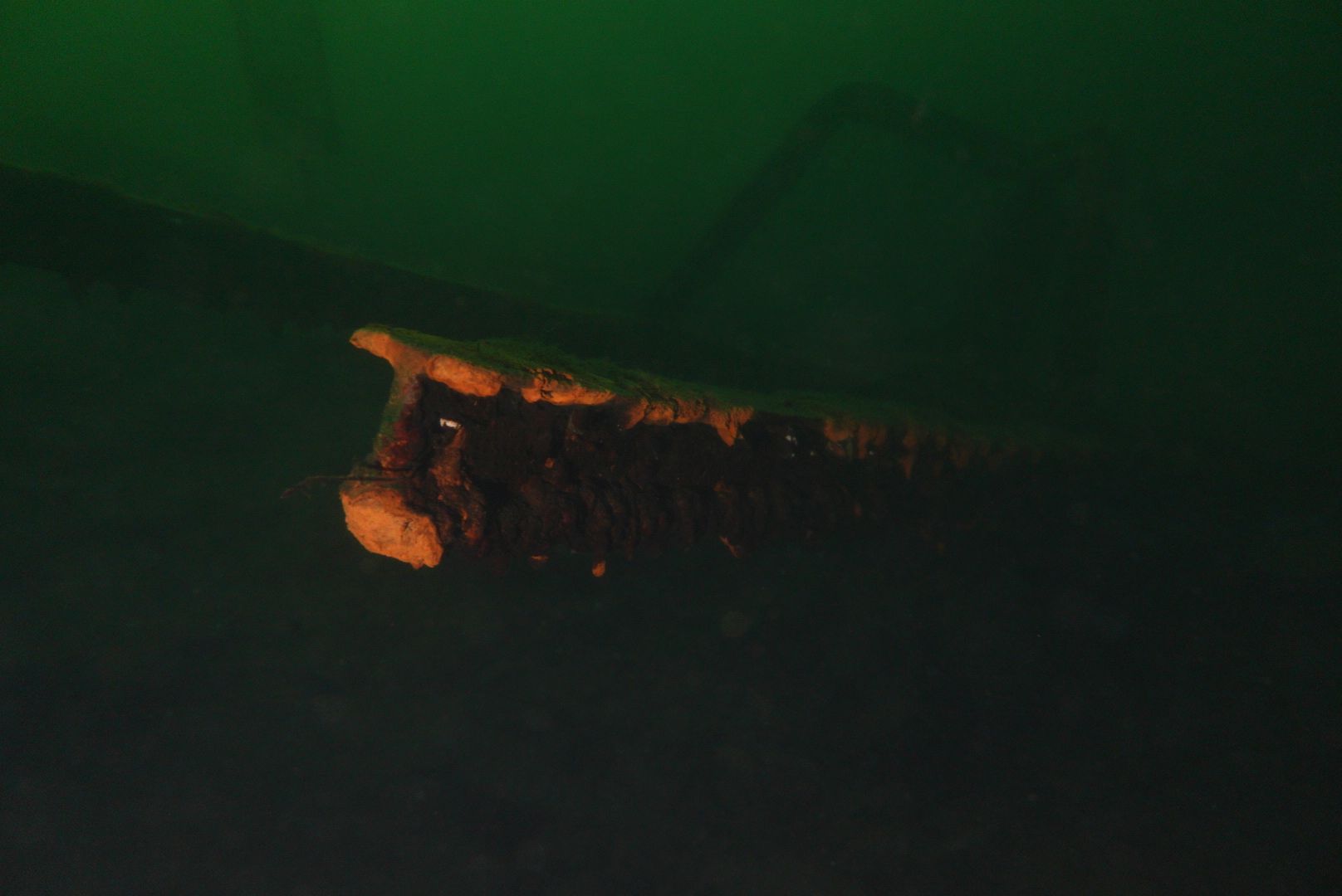 Die oberen 10 m waren extrem trübe bei 1 m Sicht. Ab 10 m wurde es besser, aber auch deutlich kälter. Aber zur Winterszeit mach ich eh meine Tieftauchgänge und kam so auch mal wieder bei der „Mühlberg“ vorbei. Auf 20 m war es stockduster. Die Silhouette der alten Elbfähre ist dann immer wieder ein „gruseliger“ Anblick. Wenn sie im Licht der Lampe aus dem Dunkelgrün auftaucht, schlägt mein Herz auch nach mehr als 30 Besuchen noch höher. Sie ist schon das schönste Binnenseewrack, das ich kenne.