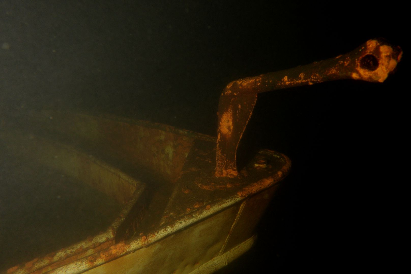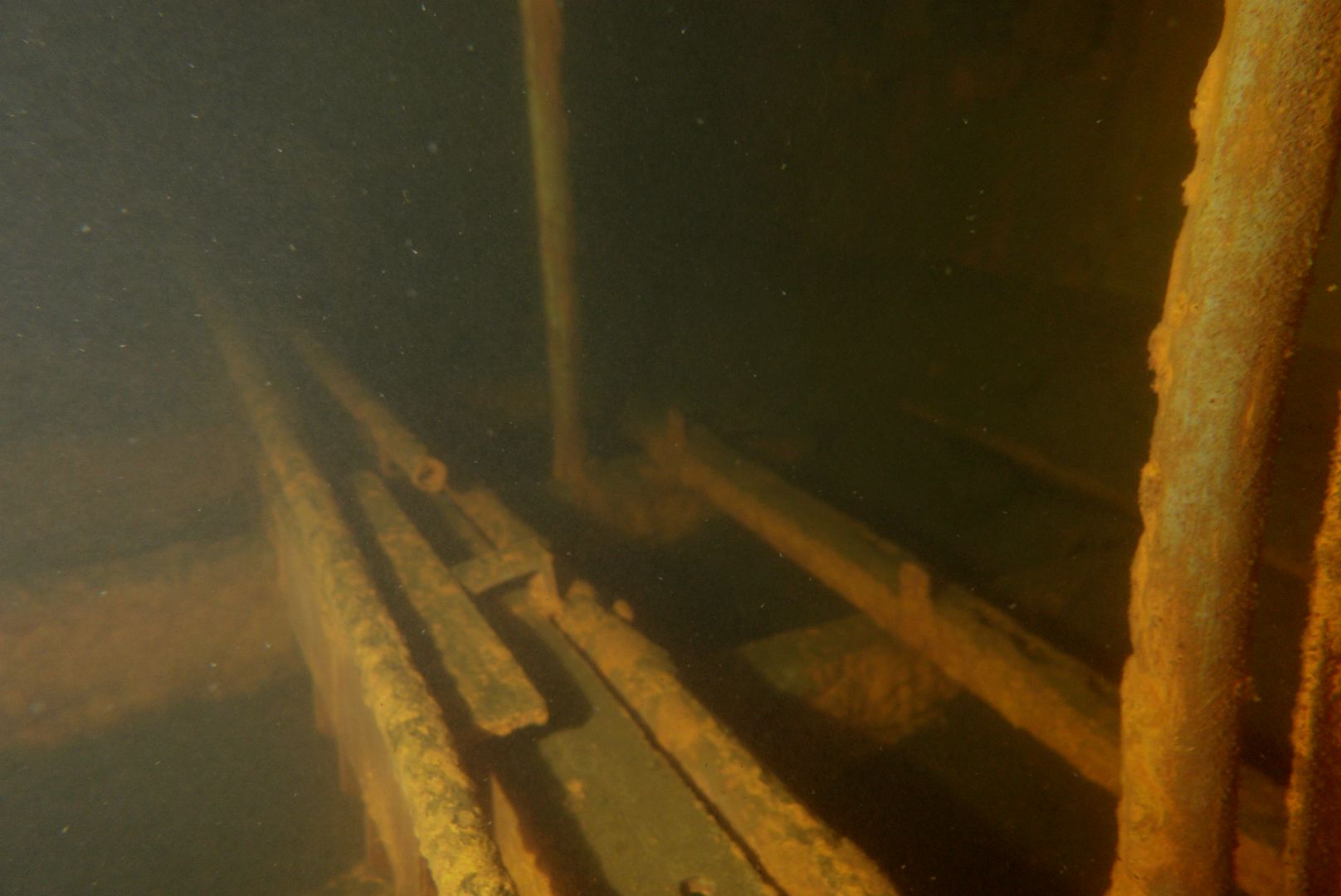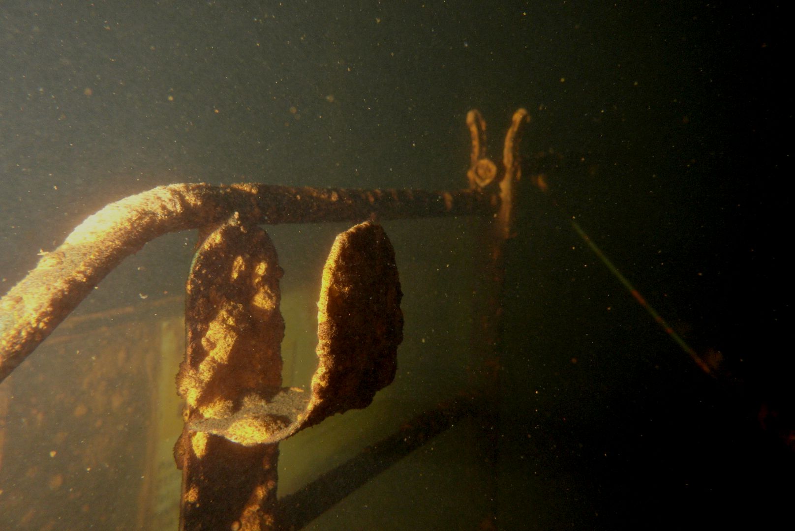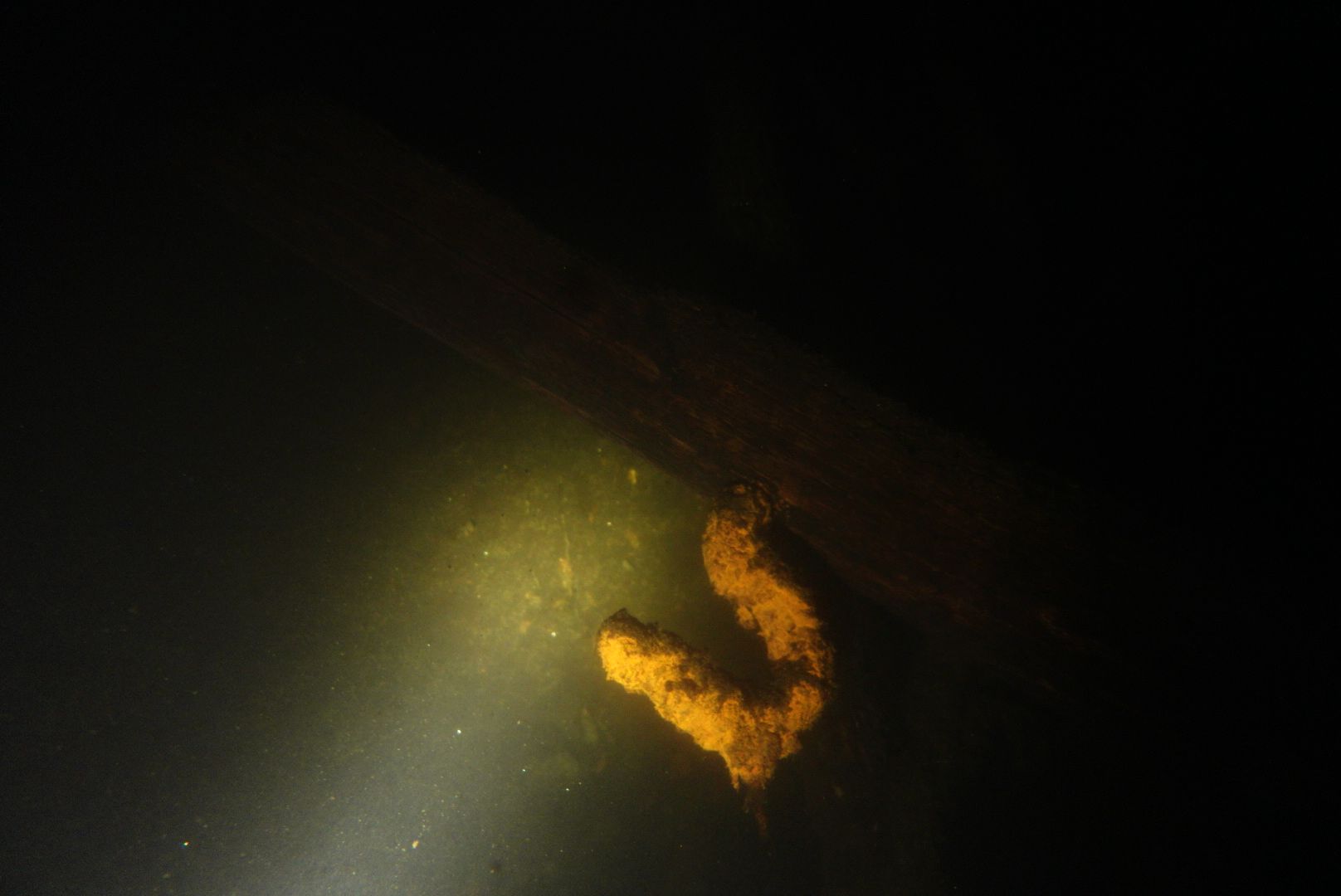 Die oberen 10 m waren extrem trübe bei 1 m Sicht. Ab 10 m wurde es besser, aber auch deutlich kälter. Aber zur Winterszeit mach ich eh meine Tieftauchgänge und kam so auch mal wieder bei der „Mühlberg“ vorbei. Auf 20 m war es stockduster. Die Silhouette der alten Elbfähre ist dann immer wieder ein „gruseliger“ Anblick. Wenn sie im Licht der Lampe aus dem Dunkelgrün auftaucht, schlägt mein Herz auch nach mehr als 30 Besuchen noch höher. Sie ist schon das schönste Binnenseewrack, das ich kenne.