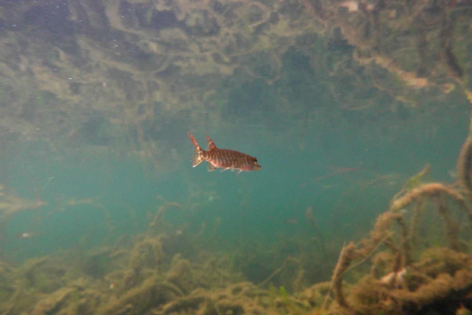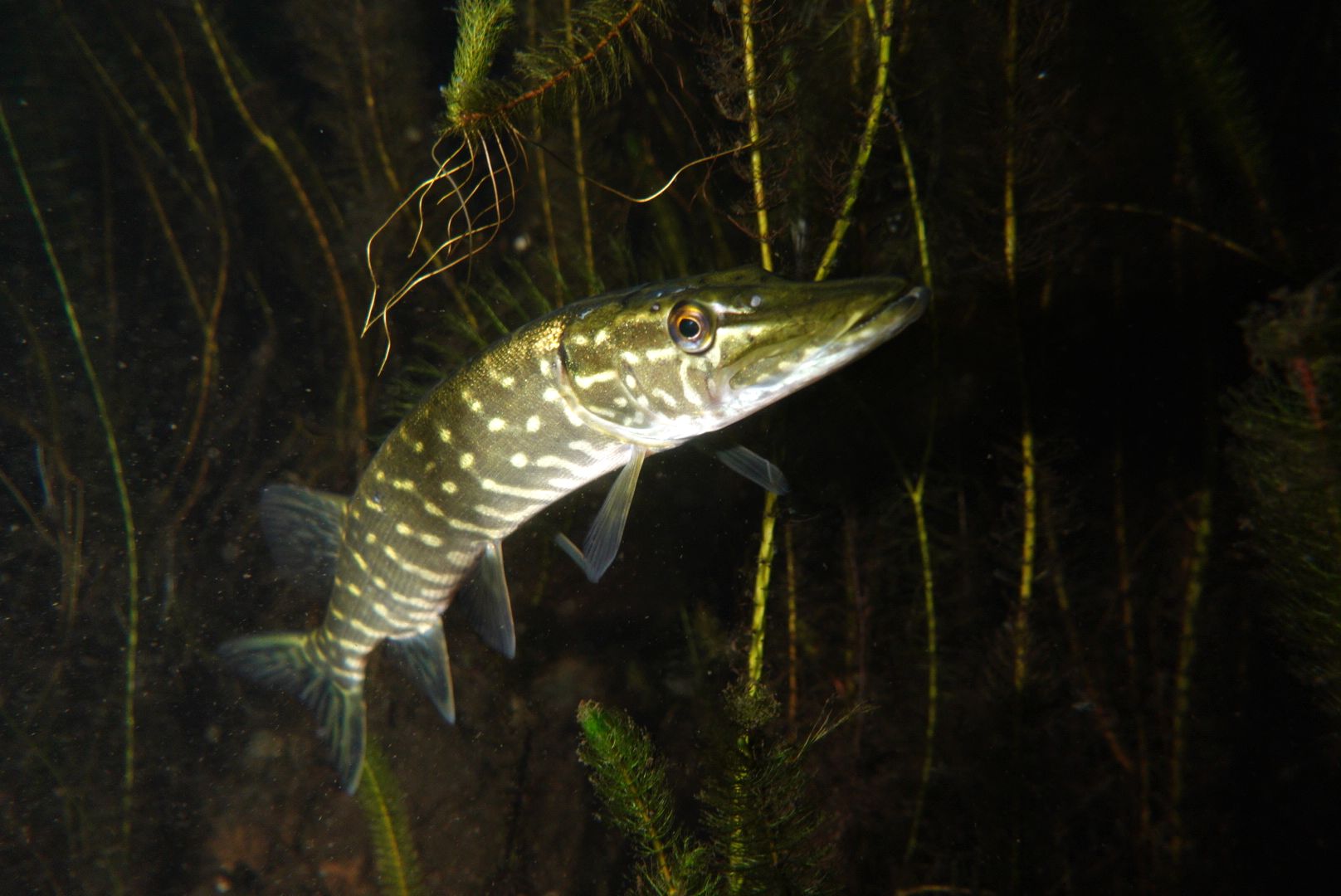 Die Schleie habe ich nun schon seit Anfang Oktober nicht gesehen. Jetzt werden die sonst so hektischen Rotfedern und Plötzen träger. Man kann also auch mal eine brauchbare Aufnahme von ihnen machen. Insgesamt wirkte der Fischbesatz schon leicht ausgedünnt. Doch alle Hechte sind noch am Anlegen von Winterreserven. In der Wahl der Jagdtaktik gibt es erhebliche Unterschiede. In Lauerstellung direkt unterhalb der Wasseroberfläche, senkrecht im Schilf stehend, verdeckt im dichten Bewuchs oder unter Baumstümpfen.