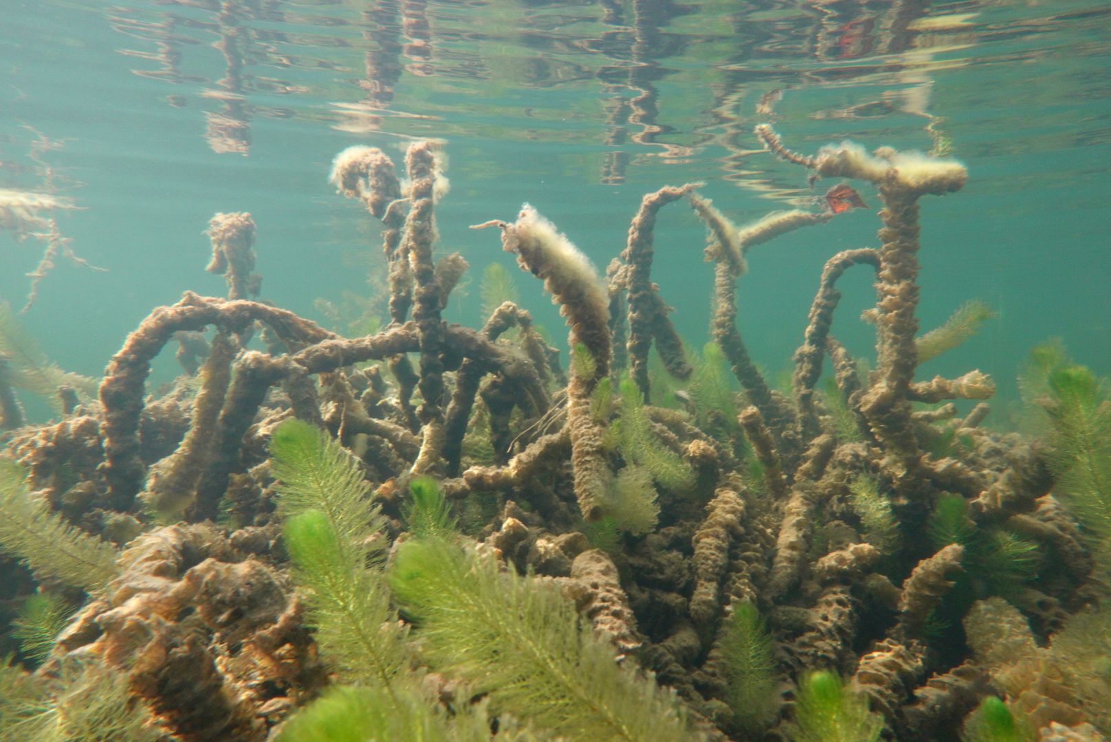 Erst auf den Bildern war für mich eine der Ursachen der krass schlechten Sicht zu erkennen. In den oberen 5m gab es trotz der niedrigen Temperaturen eine massives Auftreten von Fadenalgen (?). Die paar Wasserpolypen kommen mit filtern nicht hinterher ..