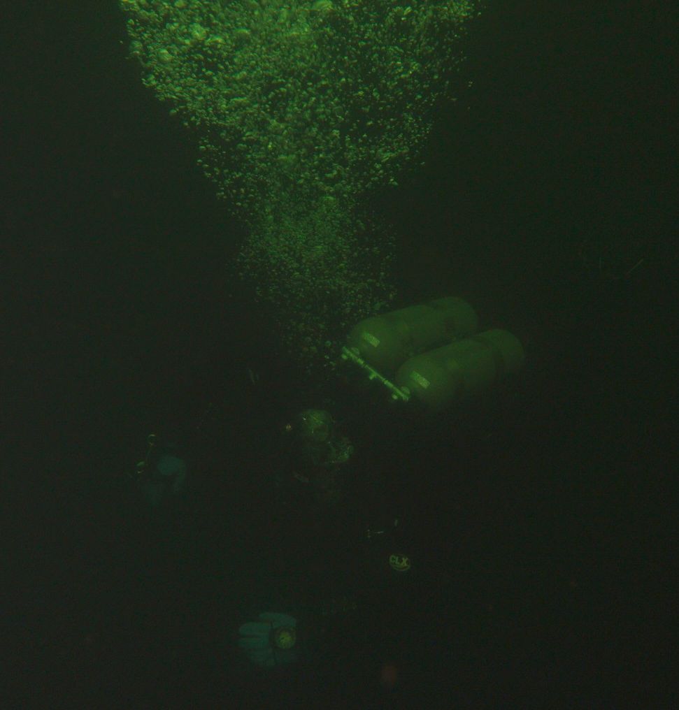 Die Idee war, dass die schlechte Sicht z.T. auf die „Auflösung“ der temperaturbedingten Sprungschichten zurückzuführen ist. OK – die Temperaturen lagen konstant zwischen 4,8 – 5,2 °C, doch bis ca. 12 m Tiefe gab es maximal einen halben Meter Sicht. Das Sonnenlicht erhellte zwar die obersten 5 Meter des Steinbruchs, doch unter Wasser war es je nach Ausrichtung zur Sonne milchig-neblig oder saharasand-gelblich trüb.