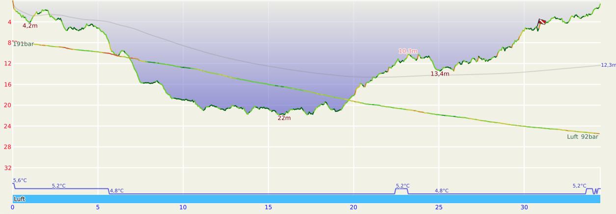 Auf 20 m war die Sicht nur minimal besser. Deshalb und wegen des niedrigen Flaschendrucks verzichtete ich auf einen Abstecher zur Mühlberg.