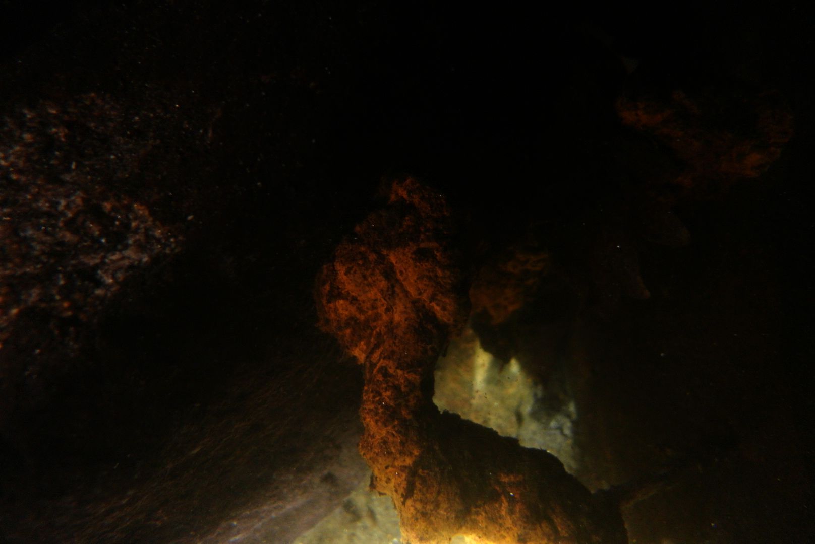 Insgesamt sehr anspruchsvolles Fotografieren, aufgrund der Sicht und des Lichtes. Um überhaupt auszulösen, musste ich in der Tiefe die Viedeolampe mit 10% anschalten und auf ISO 1000 wechseln. Weiter oben reichten dann IS0 500, aber aufgrund der extremen Streuung durch die Schwebteilchen und dem 120°-Abstrahlwinkel der Videoleuchte ist man bei „Licht an“ praktisch blind. Also Leuchte aus und zur Tauchlampe greifen – deren schmaler Lichtkegel sorgt viel besser für „Weit“sicht.