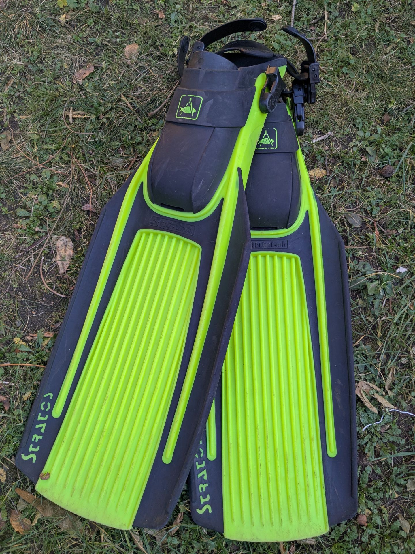 Schwere Geräteflossen für den Trocki (Apeks RK3), leichtere (Technisub Stratos) für den „dicken“ (5+7mm) Neopren. Da diese beiden Anzüge sehr häufig in heimischen Gefilden bei Sichtweiten (deutlich) unter 5 m zum Einsatz kommen, fand ich leuchtende Farben für die Flossen angemessen, da so ein Buddy leichter Sichtkontakt halten kann. Auch bei Urlaubstauchgängen mit vielen Leuten fand ich eine auffällige Flossenfarbe bei meinem Zufalls-Buddy immer hilfreich. So begleiten mich meine Stratos nun schon seit den 90igern. Sie sind auch eine prima Flosse für den Flieger, denn sie gehören trotz ihrer Robustheit zu den leichteren Geräteflossen.