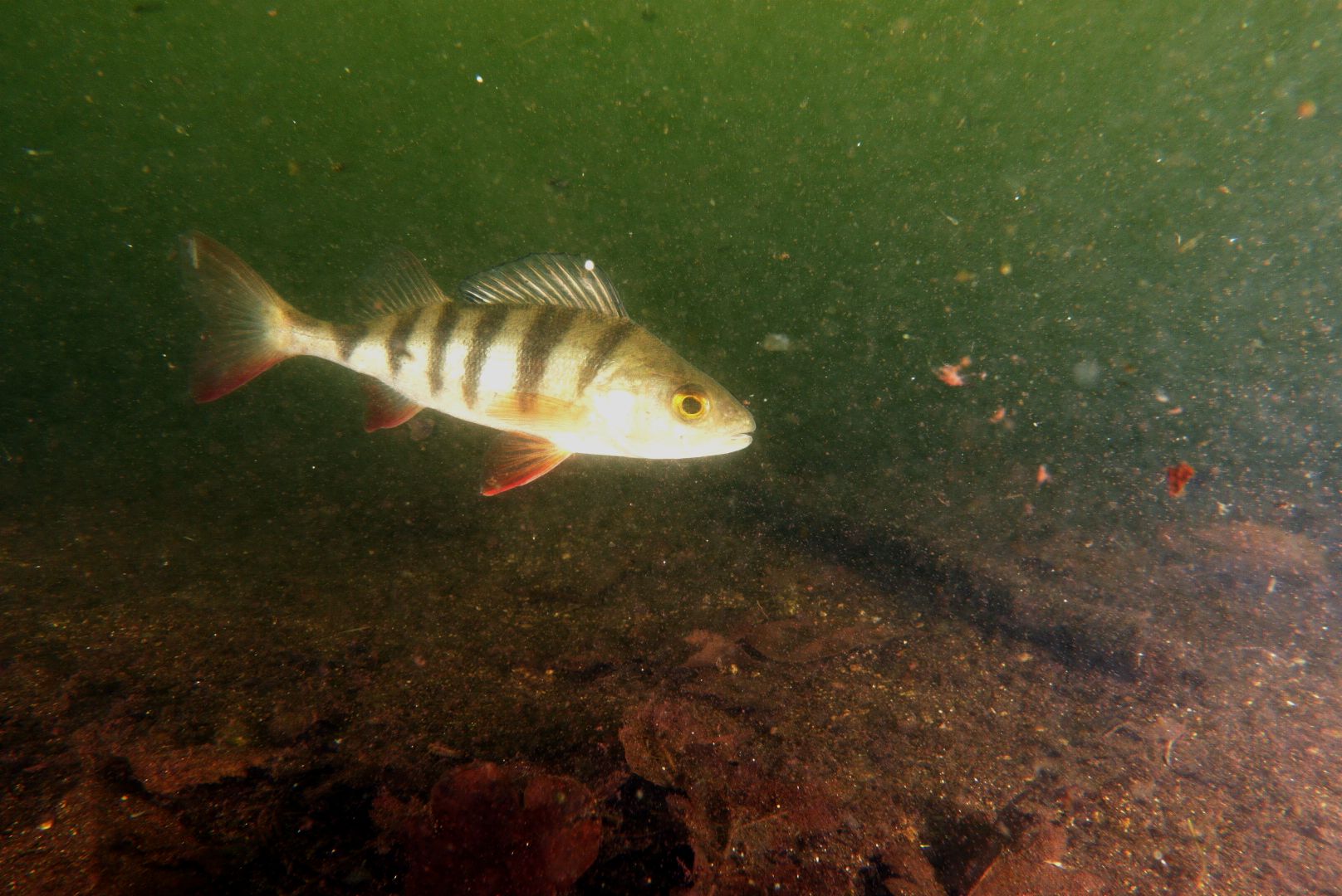 Die Hoffnung auf gute Sicht (lange Dunkelheit wegen Eis und Schnee → alle Algen tot) wurde getrübt – auf 0,5m .. Die Karpfen waren von oben zu sehen, von unten keine Chance.